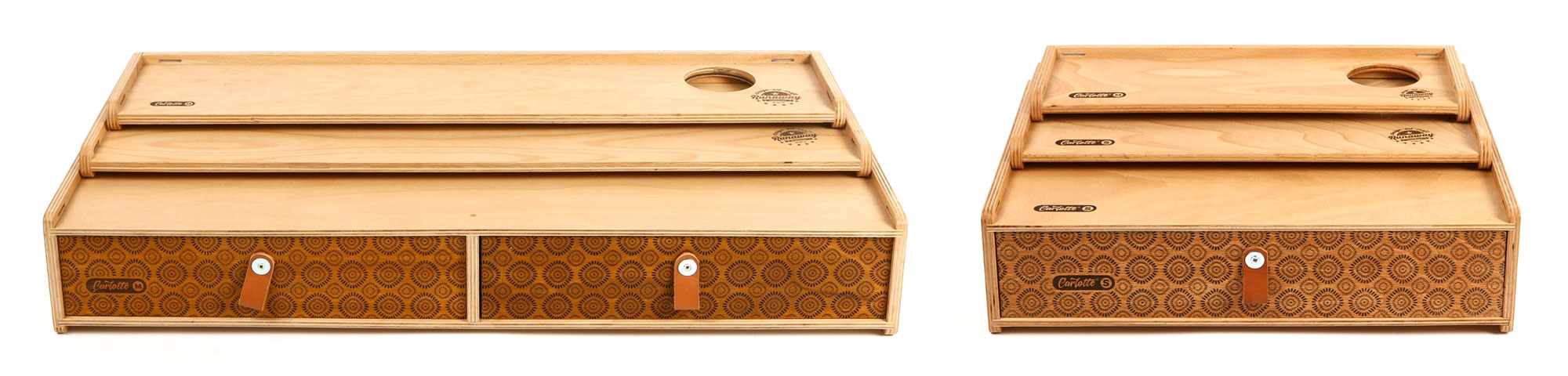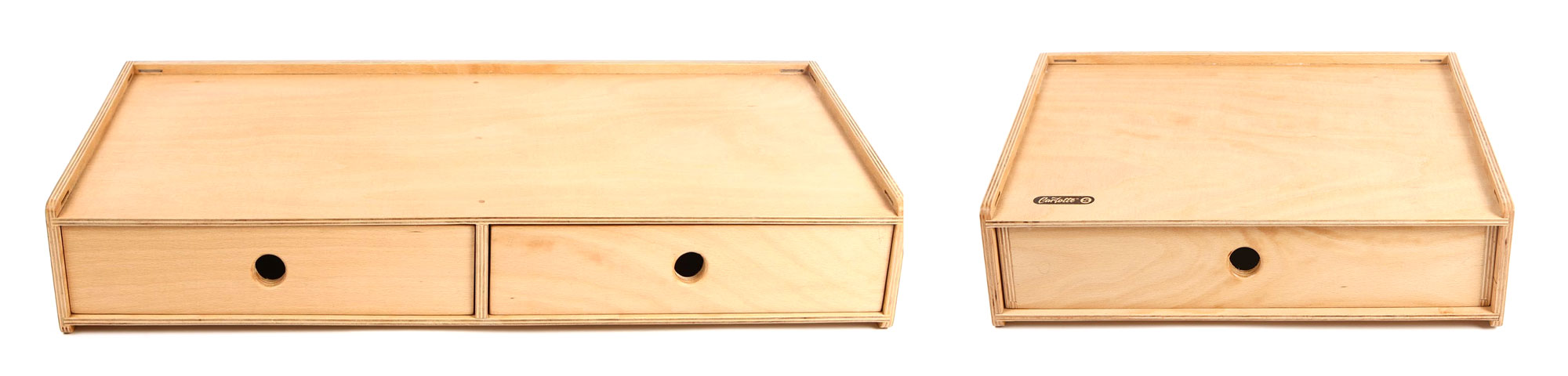 Die CarLotte gibt es in zwei Serien, die in sich flexibel kombinierbar sind. Die M-Serie ist ca. 70cm breit, hat im Korpus zwei Schubladen, die S-Serie ist um die 42cm breit und hat im Korpus eine Schublade.