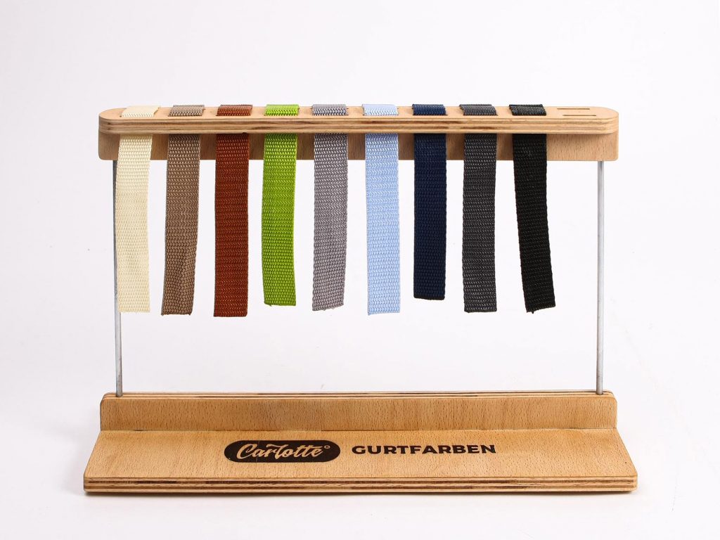 Ich versuche, alles aus nachhaltigen, möglichst umweltneutralen Materialien zu realisieren: Korpus und Regale sind aus strapazierfähigem Buchenmultiplex gefertigt, die Haken aus Stahl, Griffe aus Metall oder recyceltem Leder, die Taschen aus recycelten Baumwoll-Vorhängen. Einzig die Gurte und die Schutzhüllen der Haken sind zum Schutz des Lackes und wegen Stabilität, Haltbarkeit und Sicherheit aus Kunststoff.