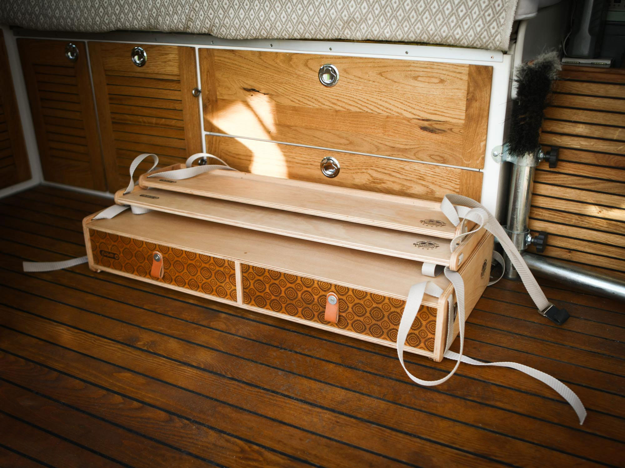 Durch die verstellbaren Gurte lässt sich die Küche und die Regalmodule optimal auf jede gewünschte Höhe und an jedes Fahrzeug anpassen. Einmal eingestellt, braucht sie nur eingehängt zu werden und ist in Sekunden wieder abgebaut, „zusammengefaltet“ und verstaut.