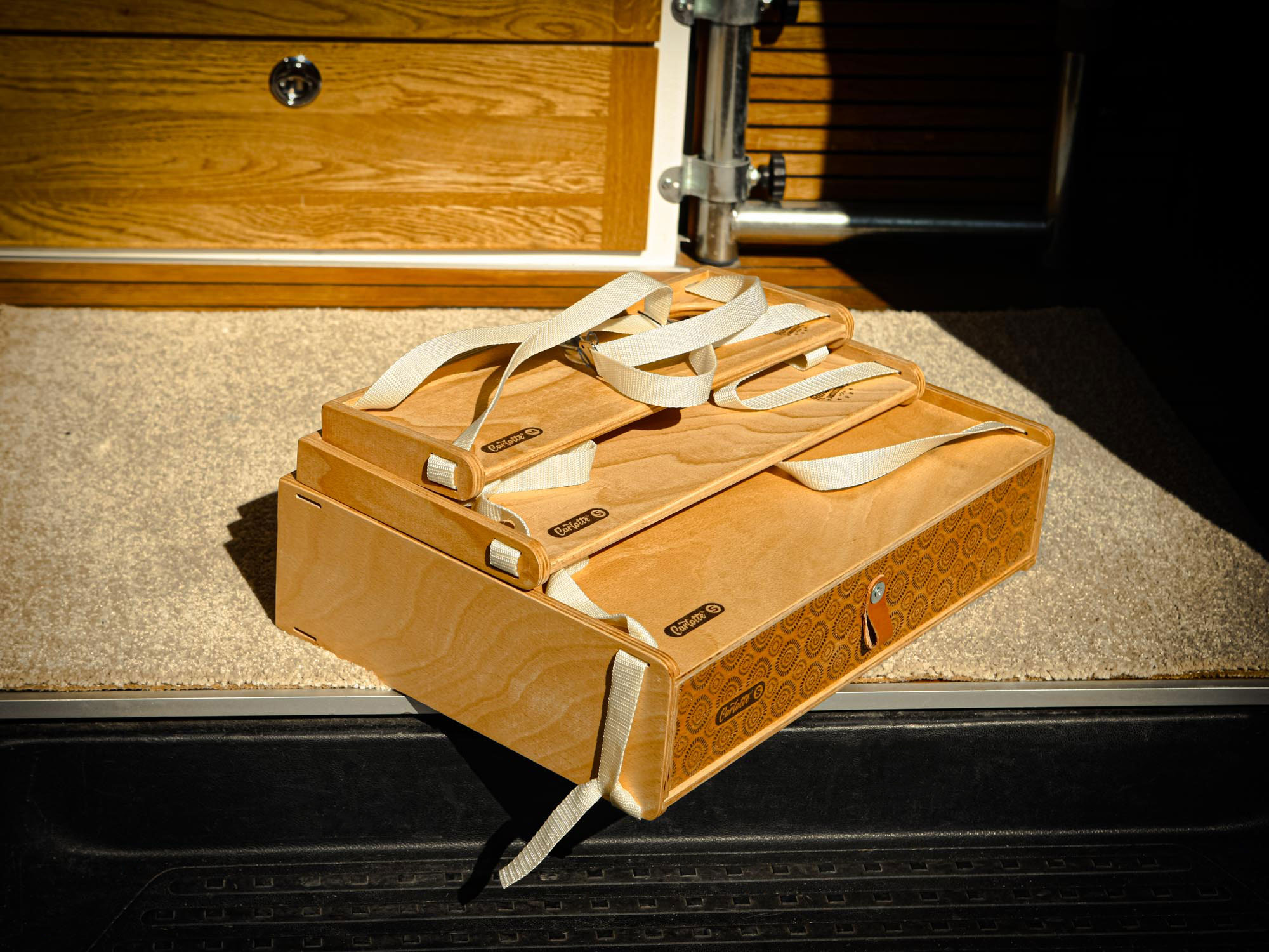 In der Vollversion hat die CarLotte einen Hauptkorpus mit zwei Schubladen. Dazu gibt es ein mittleres und ein kleines Top-Regal. Alle Teile sind auch einzeln mit den Gurten oder in anderer Kombination nutzbar. Es könnte zB. auch ein Regal unter dem Hauptkorpus angebracht werden.