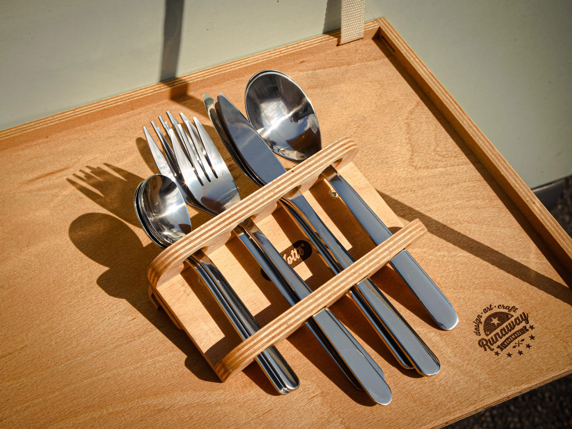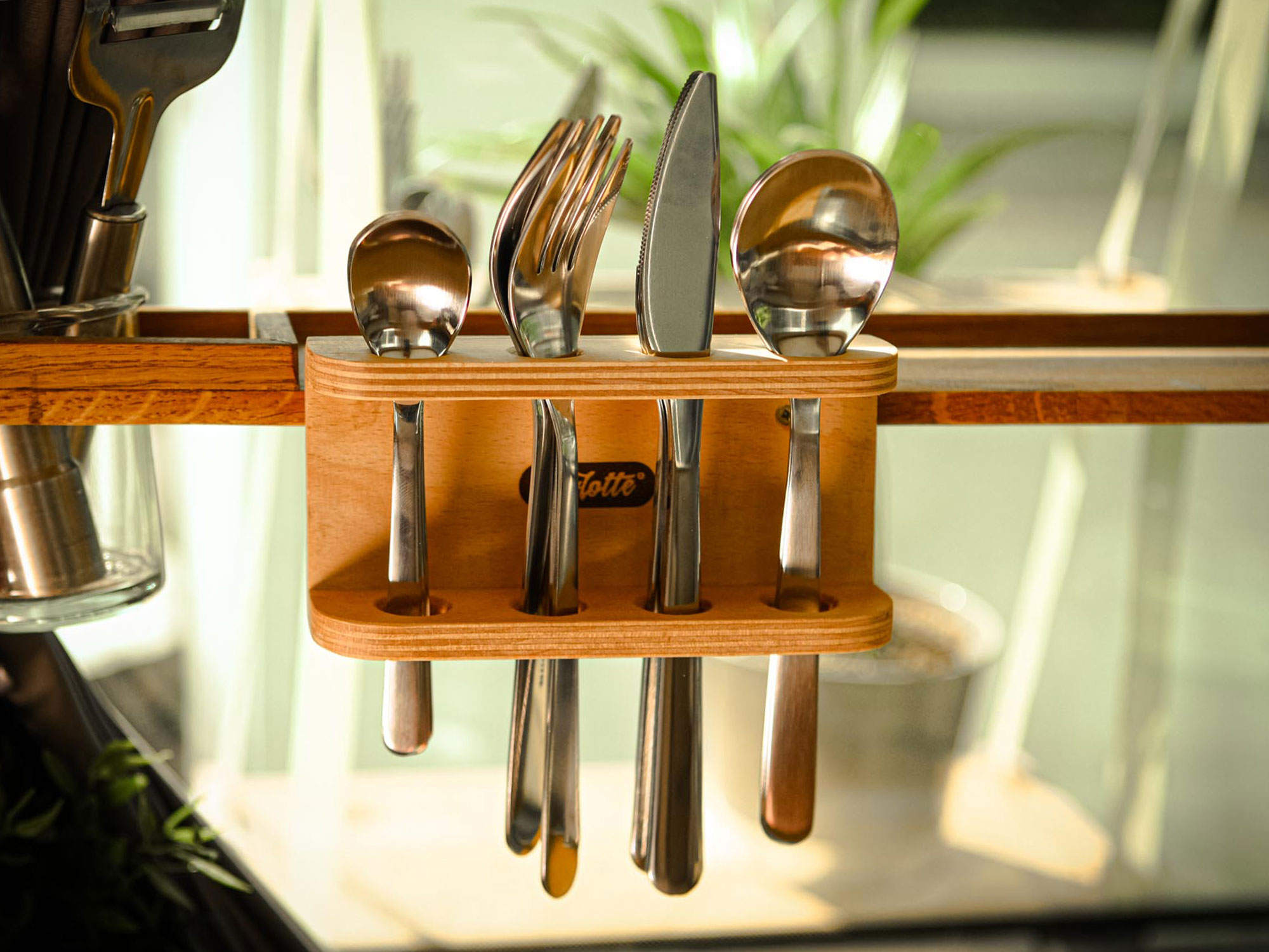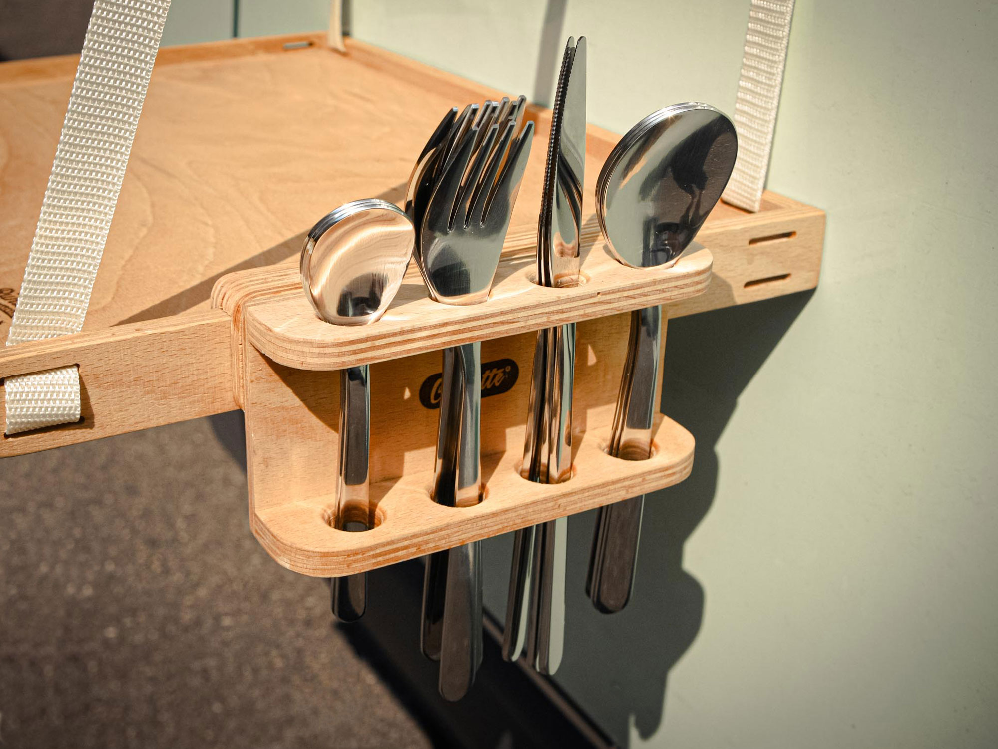 Der handgemachte Besteckhalter ist für Campingbusse und Wohnmobile oder für den Garten gedacht.