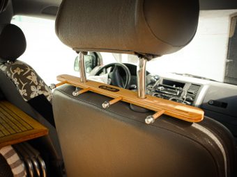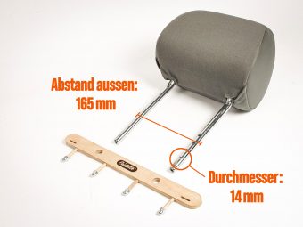 Der Haken passt an die Nackenstütze vom VW-Bus T5 oder an alle Nackenstützen mit Aussenabstand von 165mm und Durchmesser der Metallstäbe von ca. 14mm.