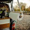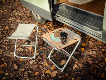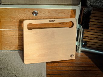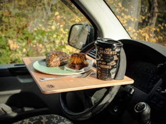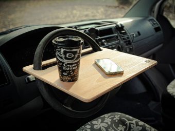 Der Tisch wird einfach über das Lenkrad gestülpt. Das war´s. Er hängt gefühlsmäßig etwas hoch. Das ist aber gut so. Der Tisch ist nicht als chilliger Coffee-Table im Bus gedacht, sondern zum Essen und Trinken. Wär doch blöd, wenn der heiße Kaffee über die Hose kippt, nur weil man ein Handy aus der Hosentasche geholt hat…