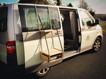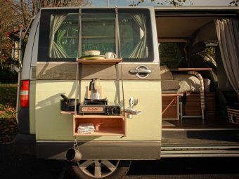 • Die Küche lässt sich aber auch mit den Gurten – in der Höhe verstellbar – an eine Fahrzeug- (Schiebe-)Tür hängen.