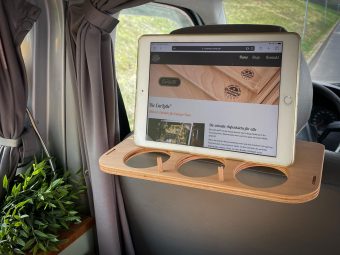 Es ist aus Buchenmultiplex handgemacht und wird mit der Nackenstütze in den Sitz gesteckt.