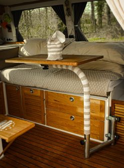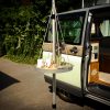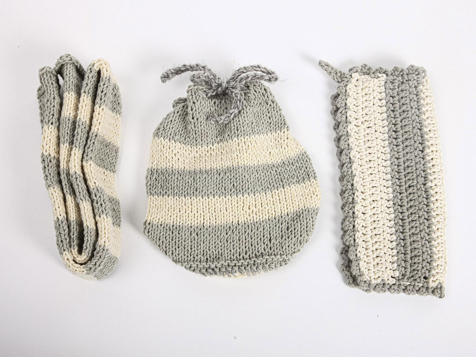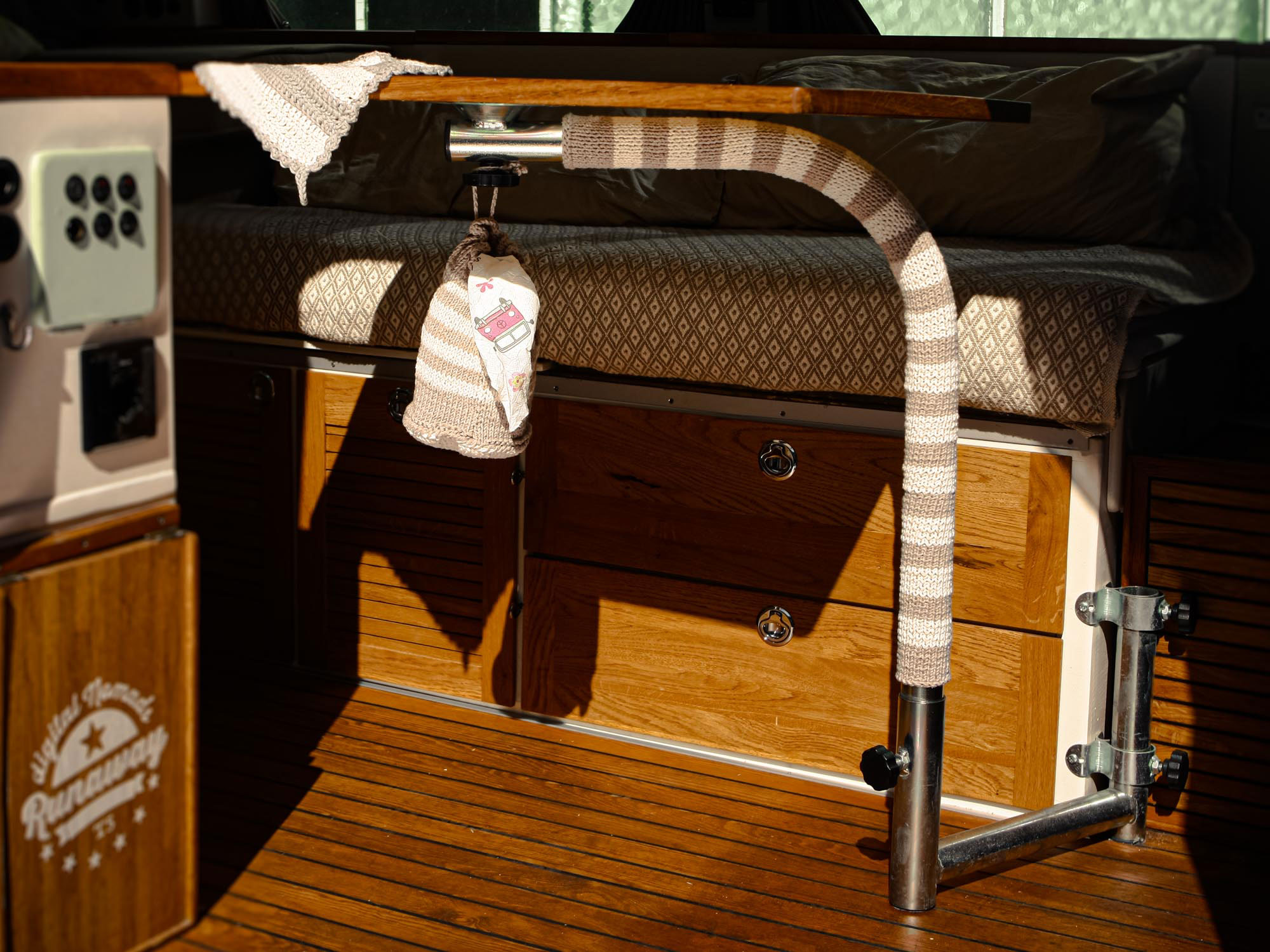 1. Ein Schlauch für einen Einbau-Campingtischfuß, damit man an kalten Tagen aber auch im Sommer nicht an das blanke Metall kommt, aber auch ein bischen als Stoßschutz. Bei mir war der Schlauch immer ein Hingucker „Oh, super, wo kriegt man den denn her?“ Deswegen habe ich meine Mutter gebeten, ein paar mehr davon zu stricken, damit ich sie hier anbieten kann. Passt für die üblichen Tischbeine, der Schlauch ist flexibel.