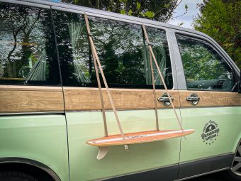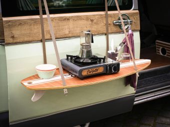 Das Mini-Surfboard XL vintage für eure Van-Tür als Ablage oder Miniküche. Da passt jetzt auch ein Kocher und einiges mehr gut drauf. Und es ist sehr leicht (2000g)